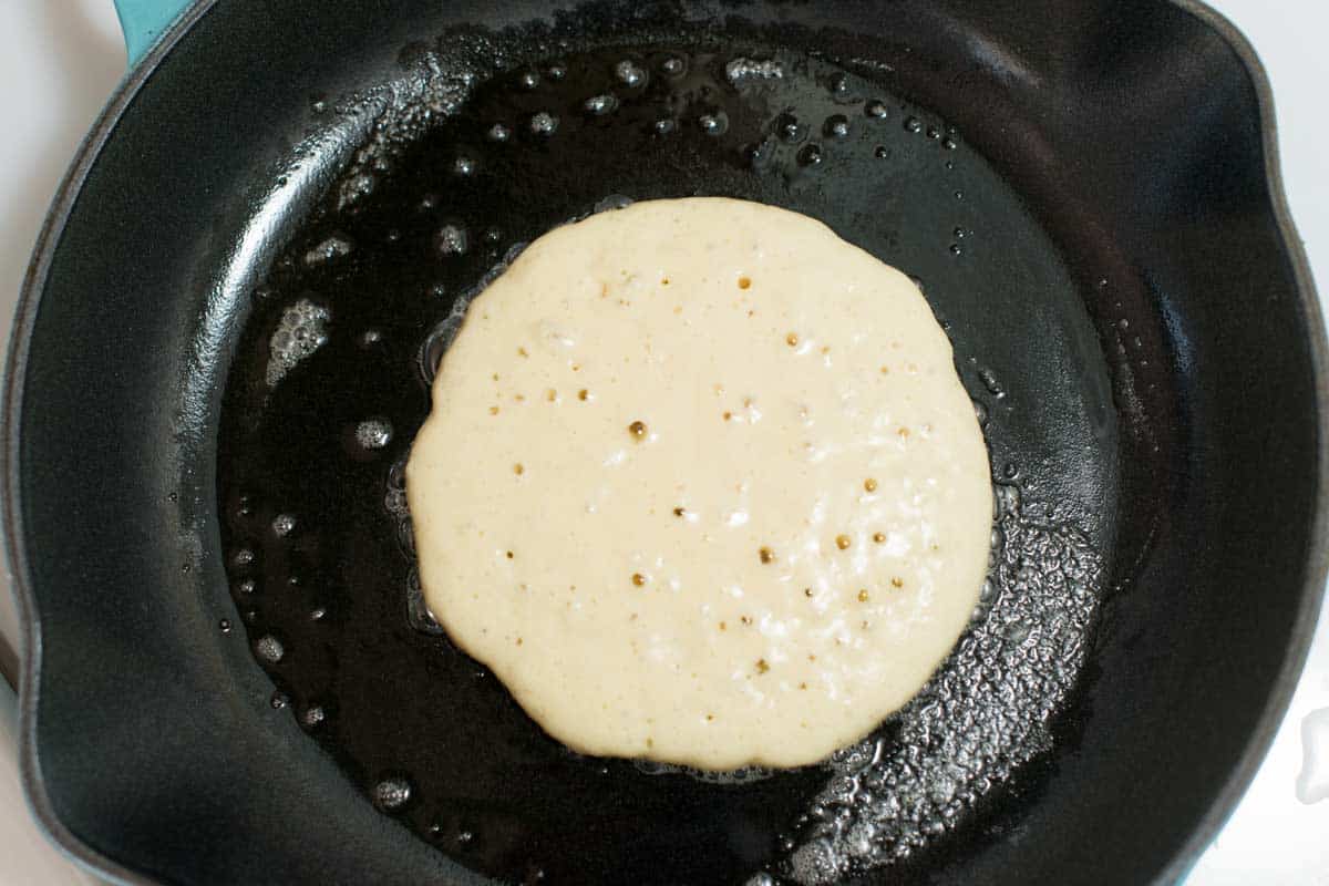 Múc 1 thìa bột đổ vào chảo, đợi đến khi mặt bánh nổi bọt liti thì lật lại, rán thêm 1-2 phút cho vàng đều.