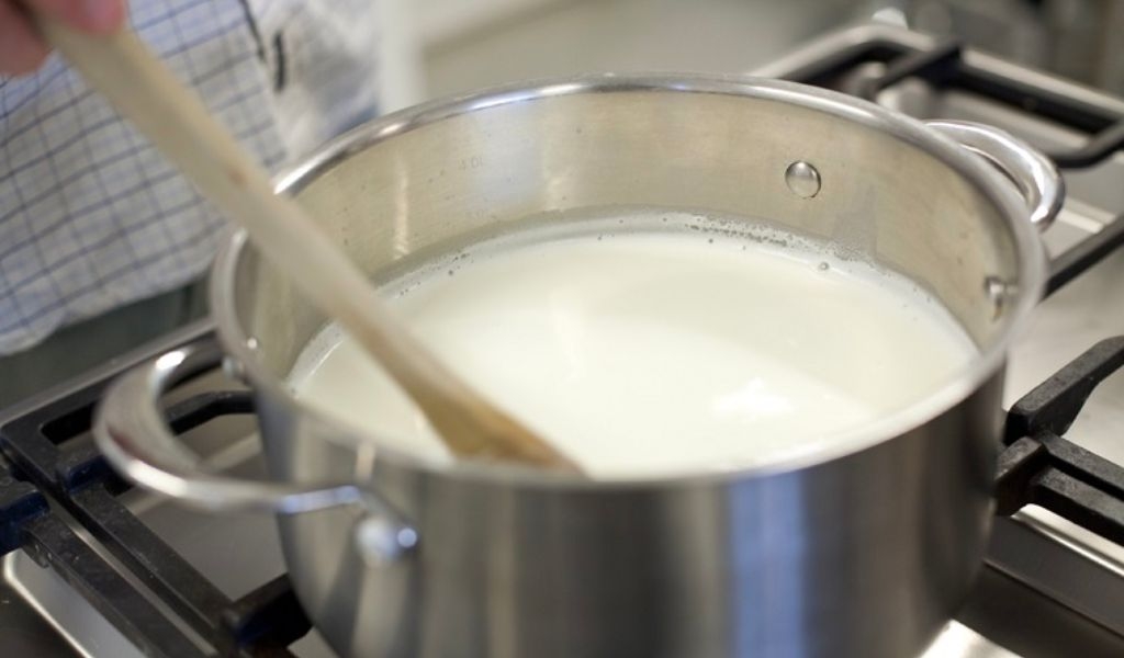 Cho sữa vào nồi, thêm muối và đun trên lửa vừa đến khi sữa sôi lăn tăn.