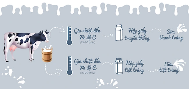 Sữa tiệt trùng, còn gọi là sữa UHT, được xử lý ở nhiệt độ rất cao khoảng 135–150°C trong vài giây. Quá trình này giúp tiêu diệt gần như toàn bộ vi khuẩn, nhờ đó sữa có thể bảo quản trong thời gian dài mà không cần giữ lạnh trước khi mở hộp.